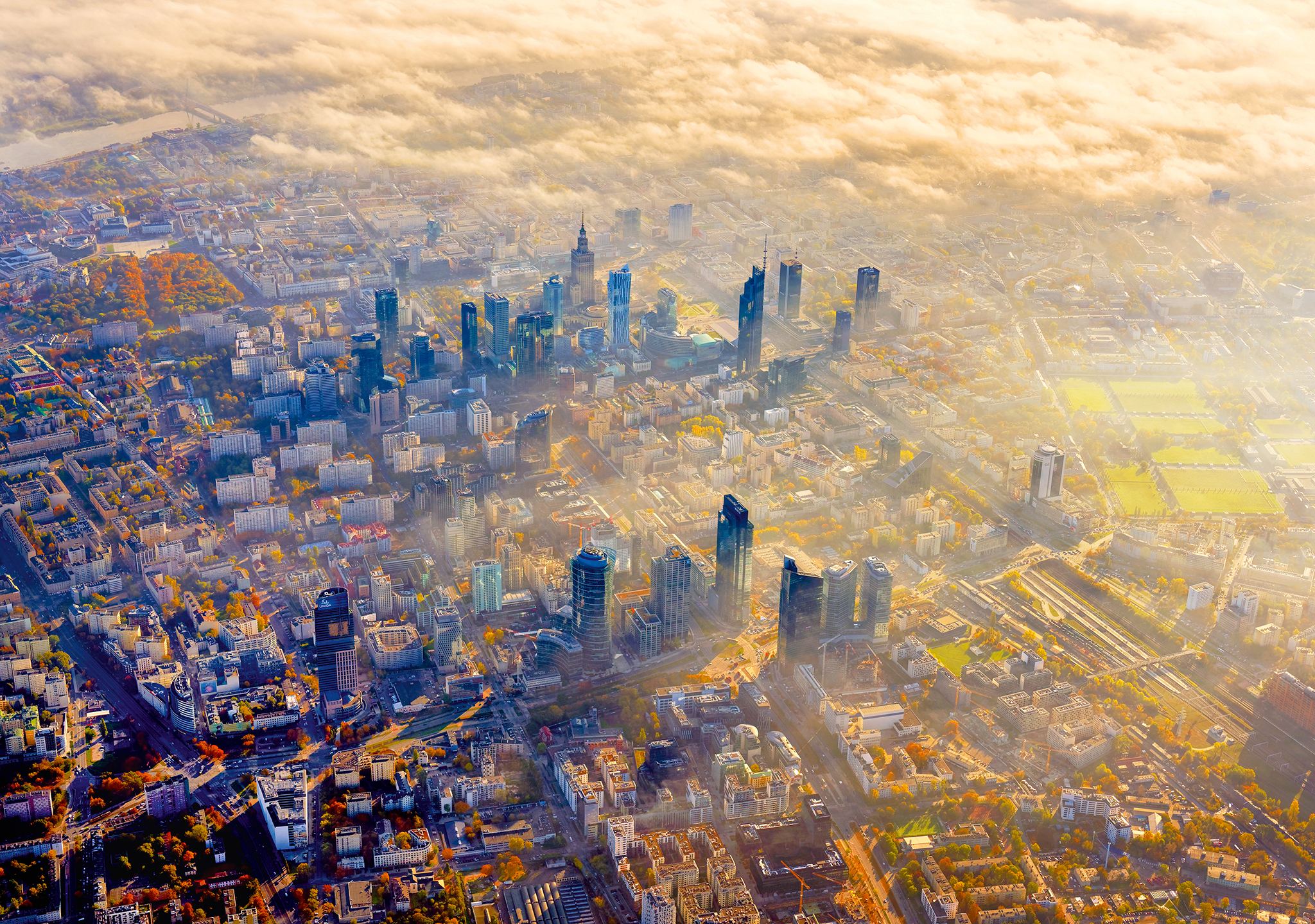 Wyjątkowa fotografia wykonana przez Macieja Margasa podczas porannego lotu nad Warszawą w trakcie sesji do albumu WARSZAWA Z NIEBA. Piękne, złociste, jesienne barwy, efektowne światło i pozujące do zdjęć miasto – czego chcieć więcej? Spojrzenie na Warszawę od zachodu zawsze robi wrażenie, szczególnie w ostatnich latach, wraz z zagęszczaniem się zabudowy Woli. Ta fotografia pokazuje jak subiektywnym określeniem może być „centrum miasta”, które w społecznym odbiorze od wieków przesuwa na zachód – zaczynając na Starym Mieście, przez Plac Piłsudskiego (dawniej Saski) i Plac Defilad, aż po linię najnowszych wieżowców. A może centrum się nie przesuwa, lecz rozszerza?